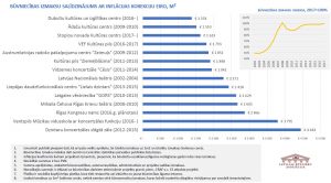 Rēķinot šodienas cenās, Ventspils Mūzikas vidusskolā būvniecības izmaksas (bez būvuzraudzības, autoruzraudzības un tehniskā projekta izstrādes) uz vienu ēkas kvadrātmetru bija 3795 eiro, 2008.-2010.gadā veiktā Mihaila Čehova Rīgas Krievu teātra remonta būvniecības izmaksas uz vienu kvadrātmetru bija 2665 eiro, bet 2010.-2013.gadā celtajā Latgales vēstniecībā “GORS” būvniecības izmaksas par vienu kvadrātmetru bija 2629 eiro. 2002.-2004.gadā veiktās Latvijas Nacionālā teātra tīrās būvniecības izmaksas par vienu kvadrātmetru, rēķinot šodienas cenās, bija 2271 eiro, bet pērn pabeigtās VEF Kultūras pils renovācijas izmaksas uz vienu kvadrātmetru, rēķinot šodienas cenās, bija 1793 eiro par vienu kvadrātmetru.